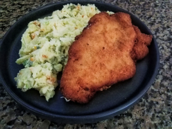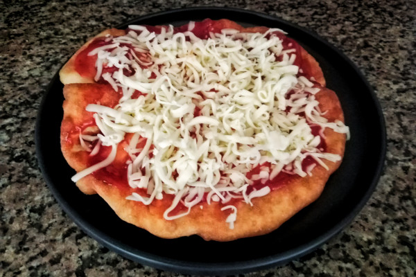Langoš z domácího těsta, kečup nebo smetana, česnek a sýr.